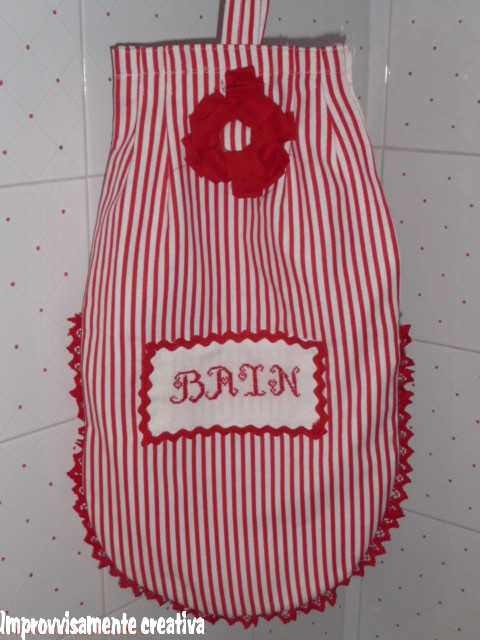 Non so se sia merito della primavera, che insieme alla natura ha risvegliato anche certi miei desideri sopiti da tempo, o se il merito sia da attribuire al fatto che per guadagnare spazio ho deciso di utilizzare qualche rimanenza di stoffe, sta di fatto che ho "partorito" in pochi giorni un'altra piccola creazione. Non mi succedeva da tempo ed era giusto un anno che avevo in programma questo lavoretto, ma per tutta una lunga serie di motivi era rimasto in stand-by (come del resto tanti altri) nella mia mente. Nei giorni scorsi finalmente ho ritrovato un po' di carica e d'ispirazione e ne ho subito approfittato. Così ora la nuova "creatura" sta facendo compagnia nel bagnetto di servizio al "cuginetto" portarotoli (infatti il tessuto é lo stesso, ho solo cambiato il senso delle righe) che l'ha preceduto di qualche giorno.